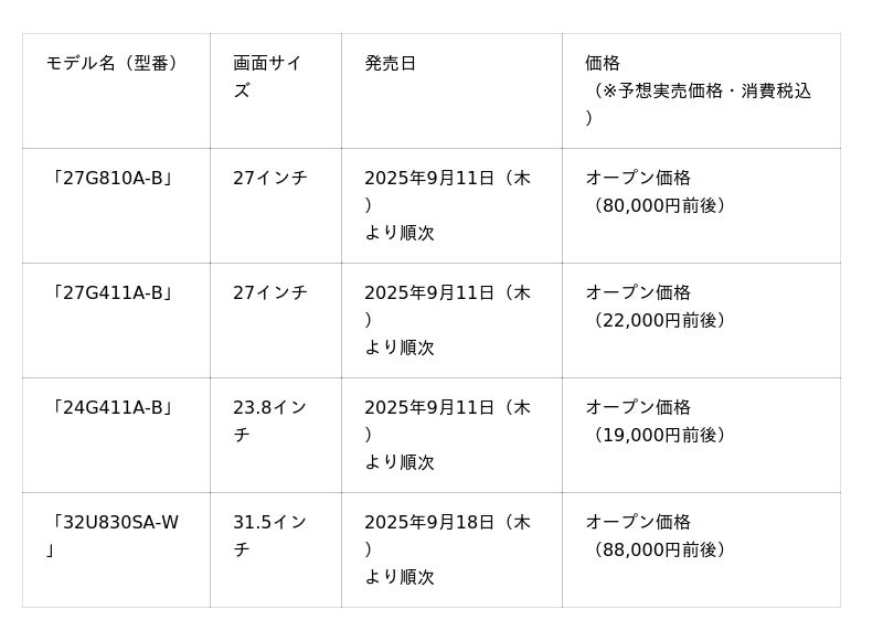 左から、「27G810A-B」、「27G411A-B」および「24G411A-B」、「32U830SA-W」