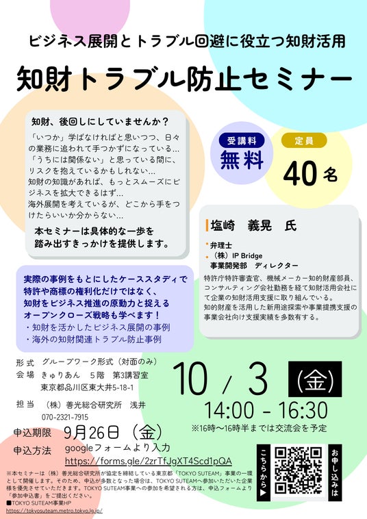 株式会社善光総合研究所(所在地:東京都港区南青山6-6-22、代表取締役社長:宮本隆史、以下「善光総研」)は、知財トラブルについてケーススタディを交えて学べるグループワーク形式のセミナーを無料で開催いたします。また、セミナーのあと30分間ネットワーキングの時間を設け、皆さんで交流を深めていただける機会もご用意しております。