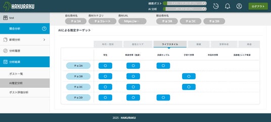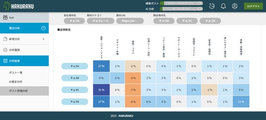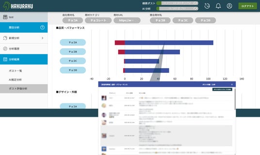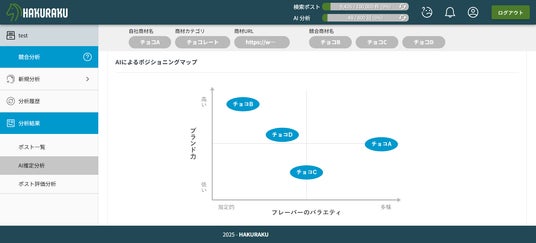 「HAKURAKU」は、SNS 等から顧客の声を収集し、データ分析・考察業務を誰でも簡単に実行できるソリューションです。従来の市場調査やユーザー分析は専門知識を持つ人材に依存し時間とコストがかかることが課題でしたが、HAKURAKUは短時間で仮説検証を繰り返し行い、新たな着想や再分析を促すことができます。これまで同サービスでは、顧客ペルソナやカスタマージャーニー、カテゴリーエントリーポイント等を生成する「基本分析」や、投稿をポジティブ/ネガティブに分類し、感情表現を含むエモーティブポストから好まれている点と課題点を整理する「ネガポジ分析」などの分析手法を提供してきました。さらに今回、競合商材との比較や自社サービスや商品のポジショニングの把握がワンストップで可能になりました。
