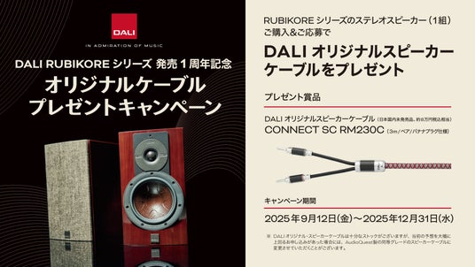 株式会社ディーアンドエムホールディングスは、2025年9月12日(金)より「DALI RUBIKOREシリーズ発売1周年記念 オリジナル・スピーカーケーブル・プレゼントキャンペーン」を実施することをお知らせいたします。