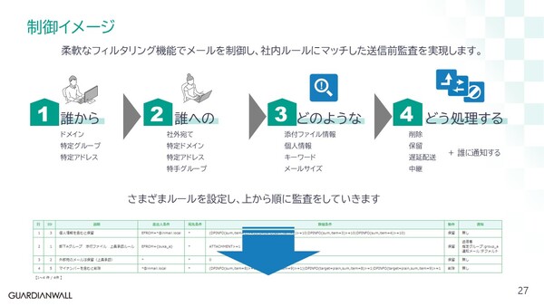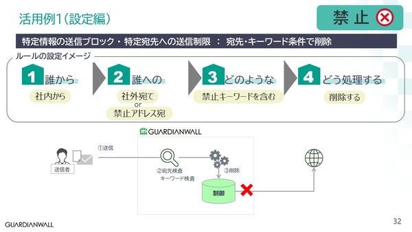 ユーザー側では、通常通りにメールの作成と送信を行う。その後、GUARDIANWALLによって、メールの内容が設定されたルールに合致しているかどうかが自動的に判定される。該当のルールに一致していた場合は削除処理が行われ、外部への送信はブロックされる。送信時点で不適切な内容の検出と遮断が可能となるため、人為的なミスや内部不正による情報漏えいリスクを未然に軽減できるのが利点だ。