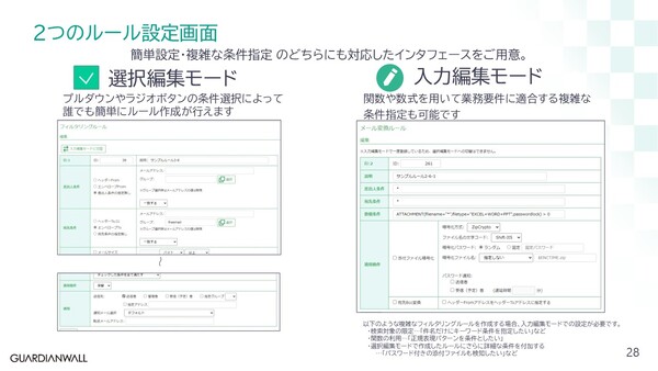GUARDIANWALLでは、利用者のスキルや目的に応じてルール設定画面を2つのモードから選択できる。まず、「選択編集モード」では、プルダウンやラジオボタンによって簡単に条件を選択できる仕組みとなっている。また、「入力編集モード」では、関数や数式を用いて、より複雑な条件設定にも対応できる。