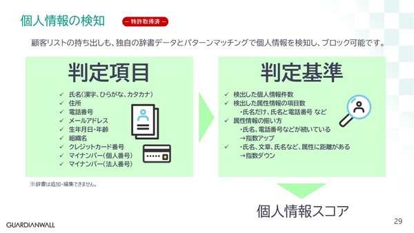 さらに、顧客リストの持ち出しを防ぐために「個人情報検知機能」を搭載している。この機能では、独自の辞書データとパターンマッチングを活用し、氏名、メールアドレス、クレジットカード番号、マイナンバーなどの個人情報を高精度で検知する。