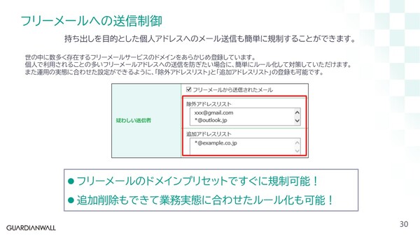 また、個人による私用メールアドレスへの送信(持ち出し目的)の制御も容易に行える。多数のフリーメールアドレスのドメインがあらかじめ登録済みなので、機能を有効化するだけで、すぐに規制を開始できる。さらに、追加登録や除外設定も行えるため、実際の業務実態に即した柔軟な調整も行える(図22)。