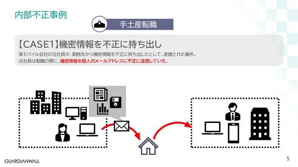 「手土産転職」の事例としては、某通信キャリアの元社員が次世代高速通信規格に関する技術情報を不正に持ち出したとして逮捕された事件が挙げられる。元社員は転職の際、機密情報を自身の個人メールアドレスへ不正に送信していた(図3)。