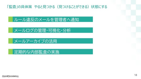 3つ目となる「監査(やると見つかる)」の具体策としては、ルールに違反したメールが送信された場合に、自動的に管理者へ通知される仕組みを導入することが挙げられる。メールログを管理し、「誰が、いつ、どのような内容のメールを送ったのか」を可視化し、事後の追跡と分析を可能にする。