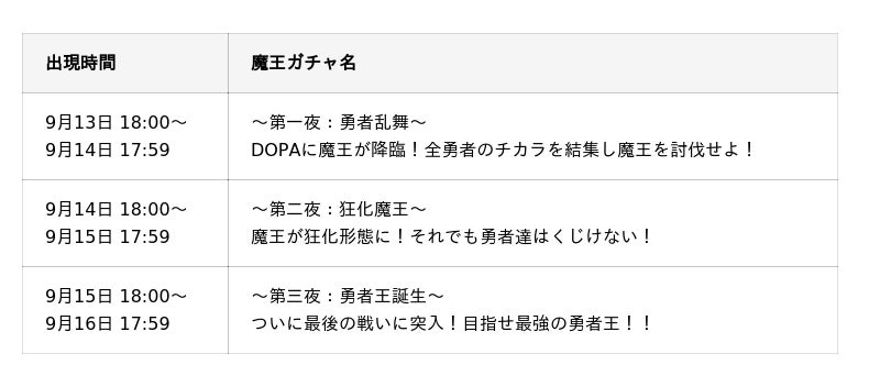 期間中、対象の魔王ガチャが1日1体(期間中合計3体)18:00から出現!