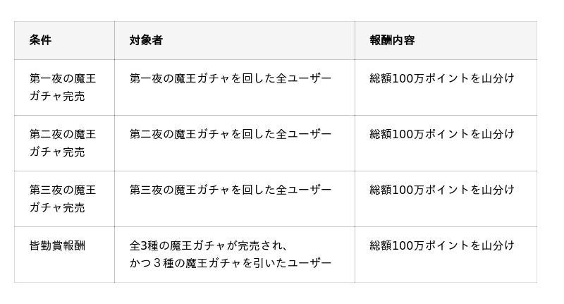 各魔王の討伐に成功すると、条件を満たした対象者全員で、最大700万ポイントを山分けすることができます。
