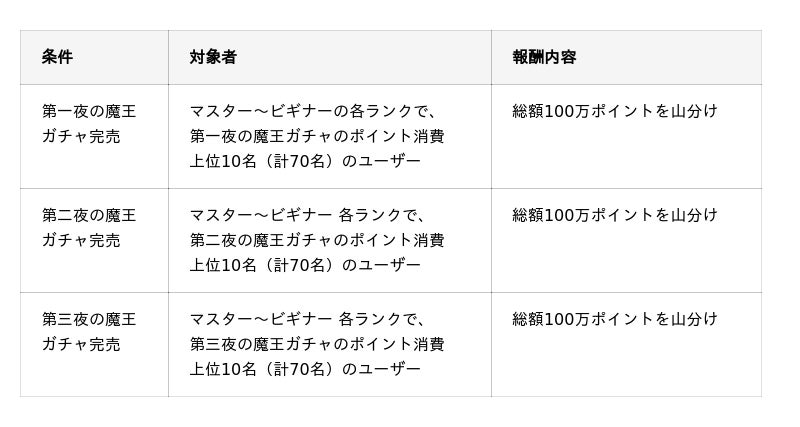 なお、上記とは別で、全3個の魔王ガチャを回した合計消費pt の総合ランキング1位~300位までの入賞者には、順位に応じて豪華報酬を贈呈いたします。