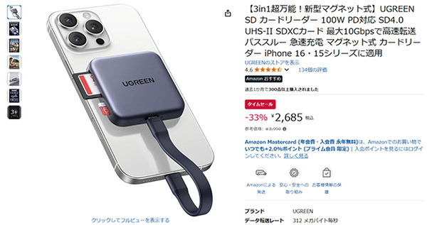 スマホアクセサリーブランド「UGREEN(ユーグリーン)」の「UGREEN マグネット式USB-Cカードリーダー」が現在、Amazonタイムセールで33%オフの2,685円という特別価格で販売中。