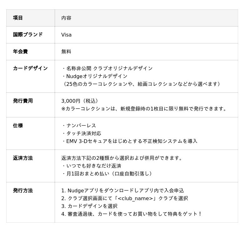 ナッジカードアプリから「名称非公開」クラブに入会の上、本カードをご利用いただくと、累計利用金額に応じて、本カードでしか手に入らない以下の限定特典を提供いたします。