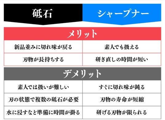 シャープナーは刃先を「破壊」して小刃付けの代わりにするため、砥石で研ぐ時に比べ、刃物の寿命が縮まります。