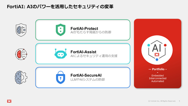 AI技術の急速な進化に呼応して、フォーティネットでは「FortiAI-Protect(AIがもたらす脅威からの防御)」「FortiAI-Assist(AIによるセキュリティ運用の支援)」「FortiAI-SecureAI(LLMやAIシステムの防御)」という3つの領域でソリューションを提供していく