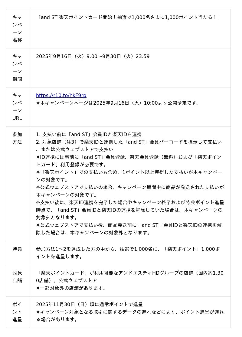 本導入を記念して、2025年9月16日(火)から9月30日(火)まで、「and ST 楽天ポイントカード開始!抽選で1,000名さまに1,000ポイント当たる!」キャンペーンを実施します。
