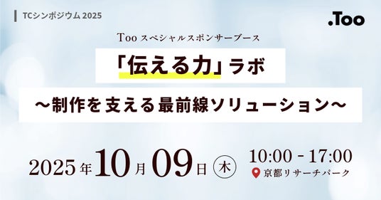 クリエイティブ市場の総合商社・株式会社Too(本社/東京都港区虎ノ門3-4-7、社長/石井剛太、以下Too)は、京都リサーチパークで開催される、テクニカルコミュニケーション技術を発信する「TCシンポジウム2025」に2025年10月9日(木)スペシャルスポンサーとして出展、「伝える力を支える仕組み」をテーマに特別セミナーとブース展示を実施します。