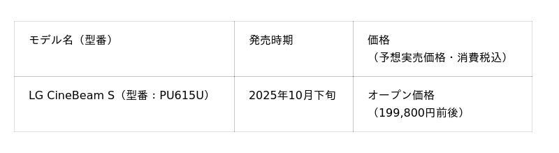 LGエレクトロニクス・ジャパン株式会社(代表取締役:孫 成周(ソン・ソンジュウ)、本社:東京都中央区)は、置き場所フリーの4Kレーザープロジェクター「LG CineBeam S」(型番:PU615U)の一般販売を、2025年10月下旬に開始しますので、お知らせします。