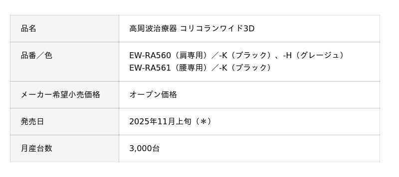 ▼[プレスリリース]高周波治療器「コリコランワイド3D」(EW-RA560、EW-RA561)を発売(2025年9月16日)