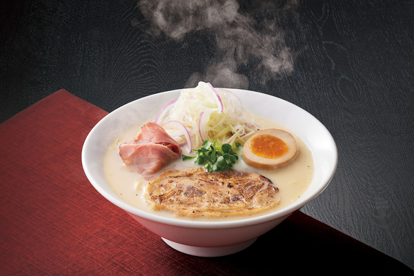 鶏ガラをじっくり炊き上げて旨みを凝縮させた濃厚白湯スープに、大判の鶏モモチャーシューと低温調理で仕上げたローストポークを合わせた贅沢な一杯です。