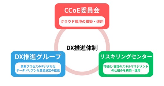 ジェイテックは、DXを推進するために、専門組織と委員会、そして人材育成の3つの柱から成る推進体制を構築しています。「DX推進グループ」を設置し、業務プロセスのデジタル化や新たなビジネスモデルの創出を主導し、「CCoE委員会」が全社的なクラウド戦略を推進してガバナンスを強化する一方、「リスキリングセンター」が全従業員のデジタルスキル向上を専門に担い、全社一丸となってDXを加速させています。また、ジェイテックのDX人材育成は、全従業員を対象とした「全社DXリテラシー向上研修」でDXの基礎知識と重要性を共有していきます。「専門スキル研修」でデータ分析、クラウド技術、AI、セキュリティなど、DX推進に必要な専門スキルの実践的な研修を実施し、iCDに基づいて従業員のスキルレベルを評価・管理し、さらに「セールススキル研修」を通じてインサイドセールスやマーケティング、広報といったセールススキルを強化することで、DXを推進する人材を育成していきます。
