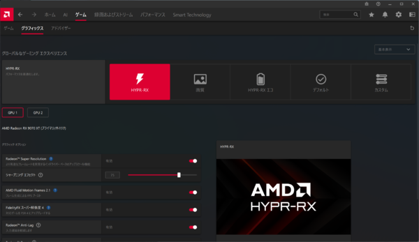 AMD SoftwareからHYPR-RXプロファイルを選択した状態。FidelityFXスーパー解像度4が有効に切り替わるが、同時にAMD Fluid Motion Frames 2.1やRadeon Anti-Lagなどの各種機能も有効になっている点は覚えておきたい