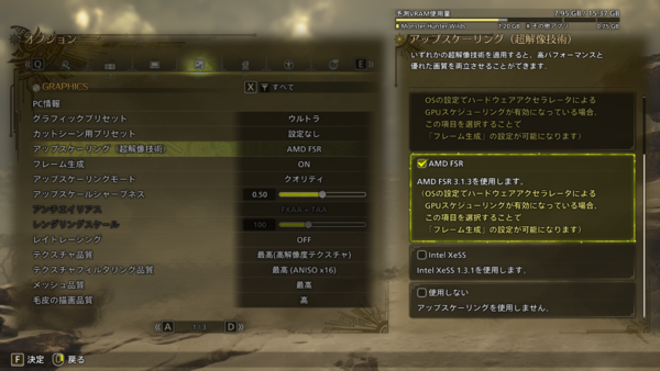 注意したいのはAMD SoftwareからFSR 4を有効にする必要があるということだ。詳しくはゲームタブのグラフィックスでHYPR-RXプロファイルに変更するか、「FidelityFXスーパー解像度4」の項目を有効に切り替えることで、FSR 4が利用可能となる。