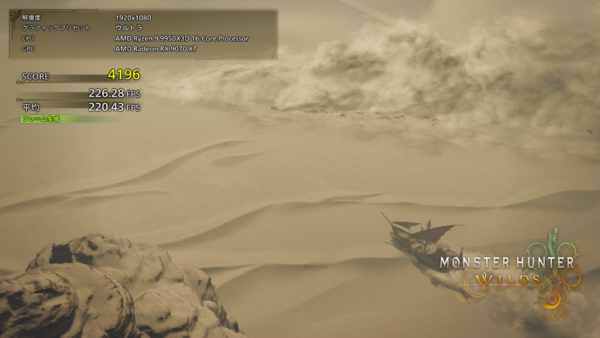 さらに、モンスターハンターワイルズ ベンチマークにおいてFSR 4を使用するとパフォーマンスがどのように変化するかも見ておこう。そこで、25.3.1でFSR 3.1を利用しフレーム生成を有効にした状態と、25.9.1でFSR 4を使用してフレーム生成を有効にした状態を比較してみたい。