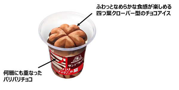 今回、「サンデーカップ」の楽しさやワクワク感をさらに味わってもらうことを目的に、上部のチョコアイスが四つ葉のクローバー型にした商品を期間限定で発売する。