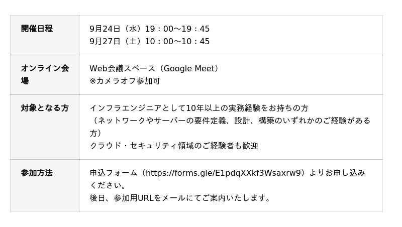 株式会社アイエスエフネット(本社:東京都港区/代表取締役:渡邉幸義、以下アイエスエフネット)は、シニア世代のITインフラエンジニアを対象としたオンライン採用説明会を、9月24日(水)と27日(土)に開催いたします。