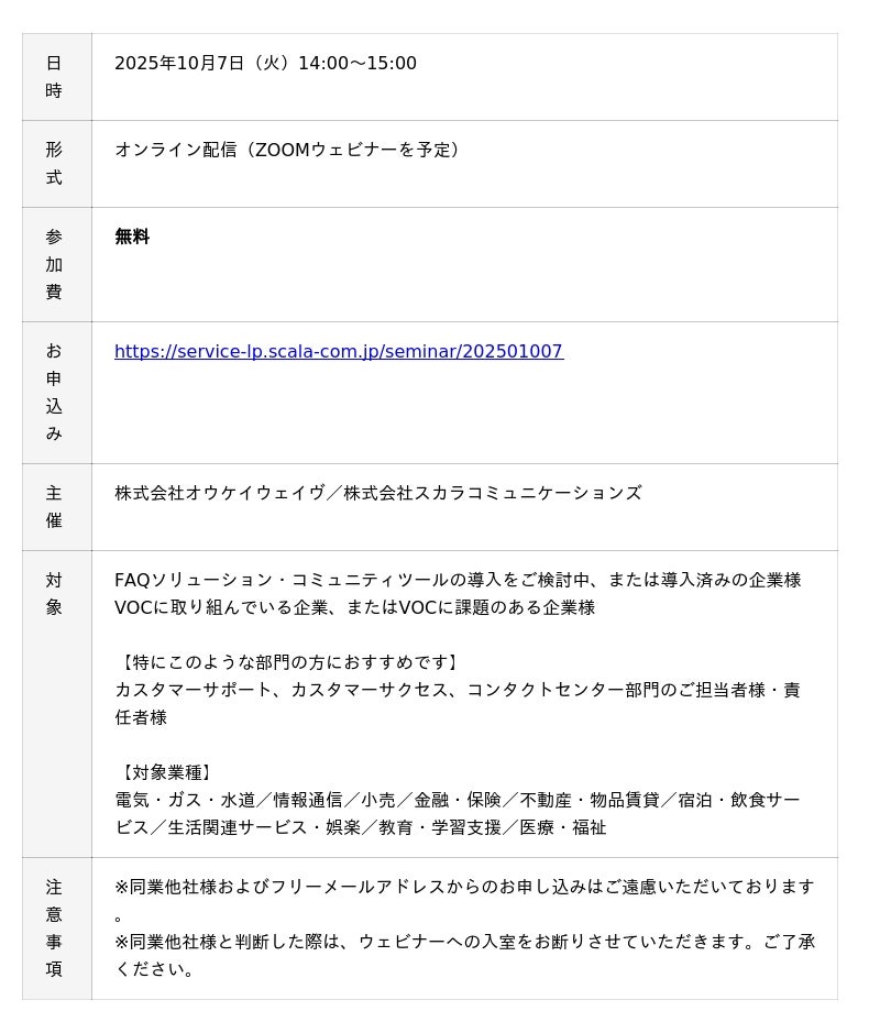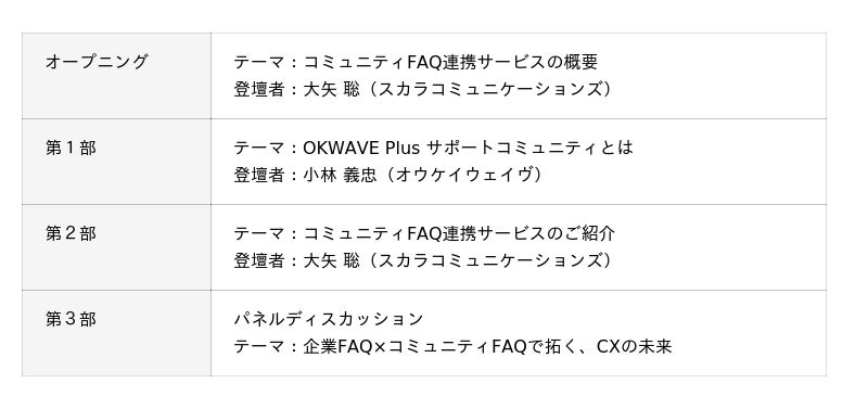 「世界中のありがとうの物語を蓄積し可視化する」をパーパスとし、法人・個人向けコミュニティサービスを展開する株式会社オウケイウェイヴ(本社所在地:東京都港区、代表取締役:杉浦 元、以下「オウケイウェイヴ」)は、「FAQサイトとコミュニティFAQの融合による次世代セルフサポートの実現」をテーマに、株式会社スカラコミュニケーションズ(本社:東京都渋谷区、代表取締役:新田英明)を共催企業として迎えた無料オンラインセミナーを開催いたします。
