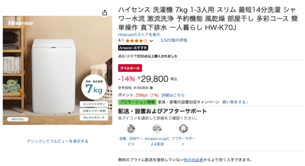 【Amazonタイムセール】一人暮らしに最適!ハイセンス全自動洗濯機「HW-K70J」