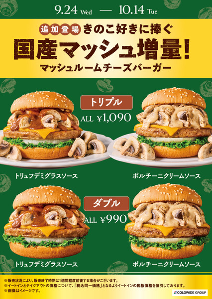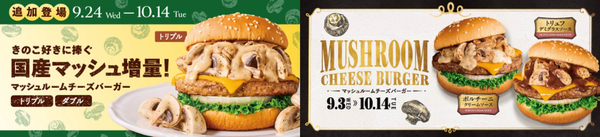 追加で登場する「トリプルマッシュルームチーズバーガー」「ダブルマッシュルームチーズバーガー」は、国産生マッシュルームの量をそれぞれ3倍・2倍に増量した商品。