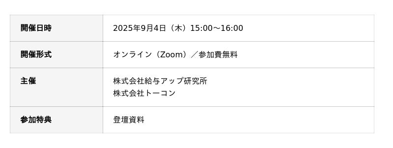 2025年9月4日(木)株式会社給与アップ研究所と株式会社トーコンの共催によるオンラインセミナー「とことん見える化!業務棚卸から始める採用と組織づくりの成功法則」が開催されました。