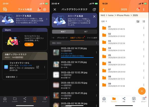 QNAP NASでは、「Qfile Pro」というスマホアプリを無料で提供している。QNAP NASにネットワーク接続すれば、スマホ内にある写真やビデオのデータを自動アップロードできる。その際、ファイル名を撮影日時に変えたり、撮影した年/月のフォルダに分類したりして保存ができるので、ファイル整理もできて一石二鳥だ。