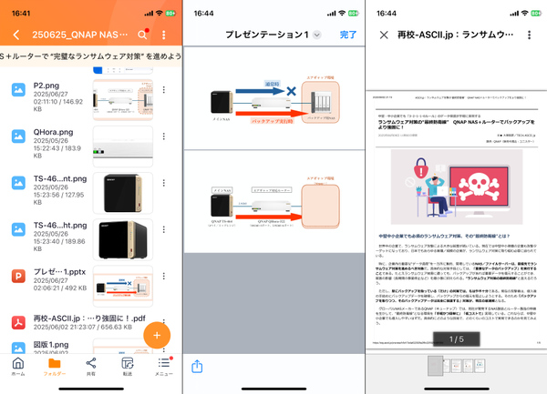 なお、このQfile Proアプリは、QNAP NASの共有フォルダにアクセスしてファイルを閲覧/編集したり、前述したQsyncの同期フォルダと同期したりすることもできる。PCだけでなく、スマホやタブレットからもNASが活用できる仕組みだ。