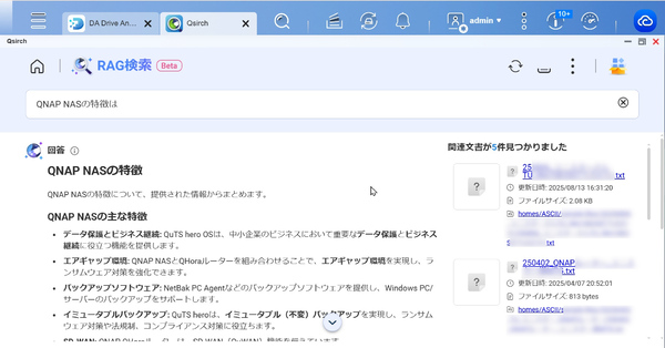 さらに、QSirchの最新バージョンでは、生成AIサービスと連携した「RAG検索機能」が追加されている(現在はベータ版)。これは生成AIが、あらかじめ指定したQNAP NASのフォルダにあるドキュメントファイルを参照しながら、質問への回答や内容の要約などを行う機能である。たとえば、契約書や規約文書といった複雑なドキュメントを読ませて要約させたり、複数の製品資料を読ませて比較のまとめを生成させたりと、幅広く使えるだろう。