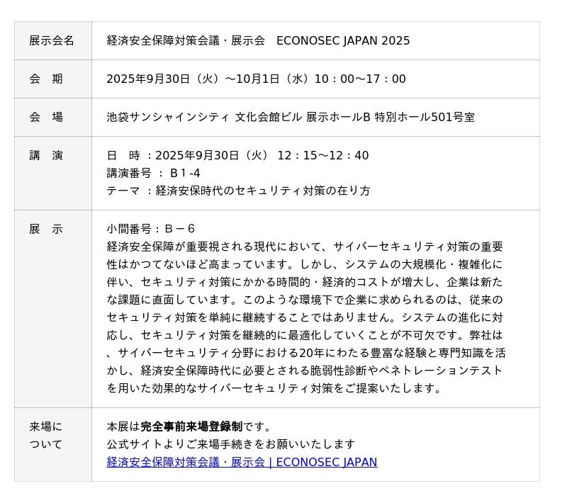 当社が手がける脆弱性診断やペネトレーションテスト、脅威インテリジェンス、インシデント調査といったサービスは、まさにこのような課題に役立つものであることから、来場者にサイバーセキュリティ管理態勢の向上の参考としていただくことを目的にECONOSEC2025で体系的に展示・説明をいたします。