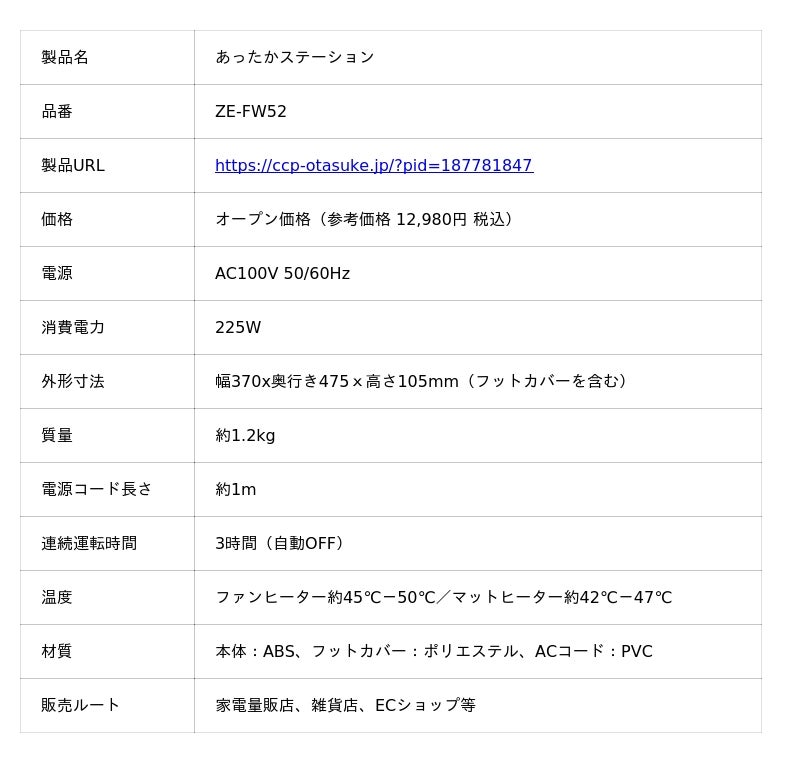 株式会社シー・シー・ピー(東京都台東区、代表取締役社長:横治 一也)は、ダブルヒーター構造で、足元と膝下の空間を同時に暖める足元ヒーター『あったかステーション』(オープン価格)を10月上旬より家電量販店、雑貨店、ECショップ等にて順次発売いたします。
