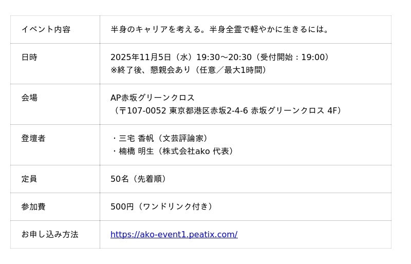 文芸評論家でありベストセラー著者の三宅香帆さんが、自身の著書『なぜ働いていると本が読めなくなるのか』で提唱した“半身”という生き方をテーマにしたリアルイベントを開催します。共に登壇するのは、3児の父で2拠点生活を送り、PR・企画の会社の代表である楠橋明生。多様なキャリアや家庭、趣味との向き合い方を見つめ直す本イベントは、東京都港区・赤坂にて11月5日(水)に開催決定。参加費500円のワンドリンク付きで、現在参加受付中です。