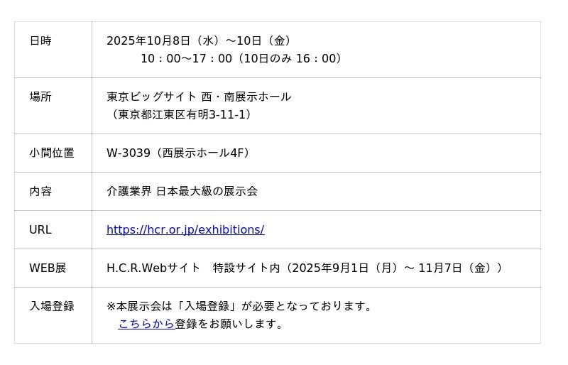 H.C.R.2025は、国内最大級の福祉・介護機器展示会であり、最新の介護・福祉機器や技術、サービスを一堂に集め、体験・情報交換ができるイベントです。介護・福祉・医療関係者だけでなく、幅広い業界関係者が最新の技術や製品を直接確認できる場として注目されています。