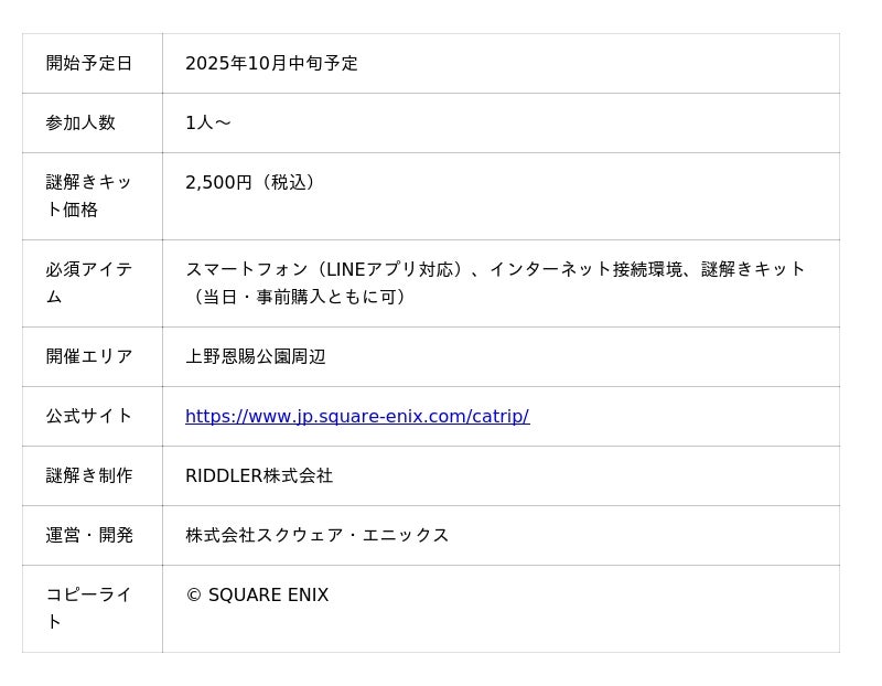 なお、2025年10月の開始に先立ち、謎解きキットの予約受付を開始していますので、詳細は「Catrip」公式サイトをご確認ください。