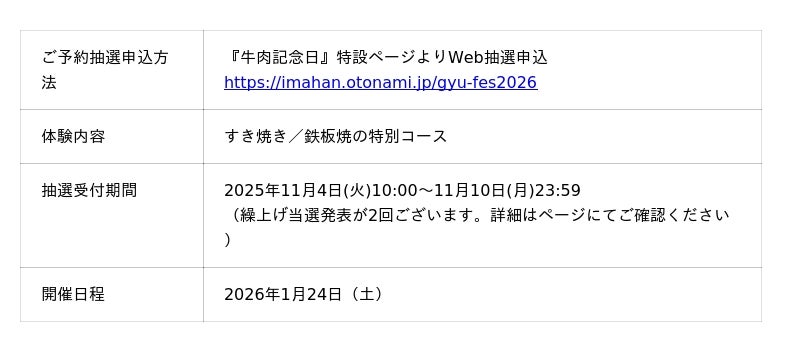 J-CAT株式会社(本社:東京都港区、代表取締役:飯倉 竜)が運営する、大人の非日常体験をお届けする「Otonami(おとなみ)」は、老舗すき焼き・鉄板焼の名店「人形町今半」、鉄板焼ステーキ「喜扇亭」(株式会社人形町今半、本社:東京都中央区、代表取締役社長:高岡 哲郎)と連携し、2026年1月24日開催予定の『牛肉記念日』特別企画において、初のWeb抽選予約システムを提供いたします。