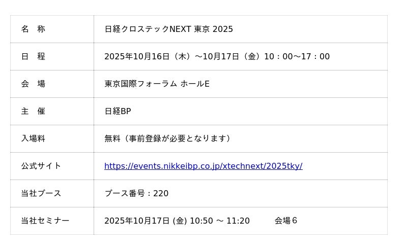 情報を暗号化した上で分散管理する「秘密分散技術」によりデータの保護、データの利活用を追求する株式会社ZenmuTech(ゼンムテック、以下、ZenmuTech、代表取締役社長CEO:阿部 泰久、本社:東京都中央区、証券コード:338A)は、2025年10月16日(木)~17日(金)の2日間、東京国際フォーラム(ホールE)にて開催予定の「日経クロステックNEXT 東京 2025」に出展します。