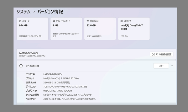今回試用したのは「Intel® Core™ 7 プロセッサー 240H」に「NVIDIA® GeForce RTX™ 5060 Laptop GPU」/メモリー32GB/ストレージ1TBという構成のモデルだ
