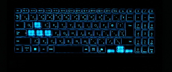キーボードはテンキー付きの102キー日本語配列。ゲーミングノートPCのシャープなイメージを演出するため、青色のイルミネートが内蔵されている。