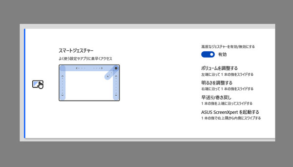上端には早送り/巻き戻し、左端にはボリューム調整、右端には明るさ調整、右上端から内側スワイプにはユーティリティー「ASUS ScreenXpert」の起動が割り当てられている。タッチパッドの機能性を重視するASUSノートPCならではの独自機能だ。