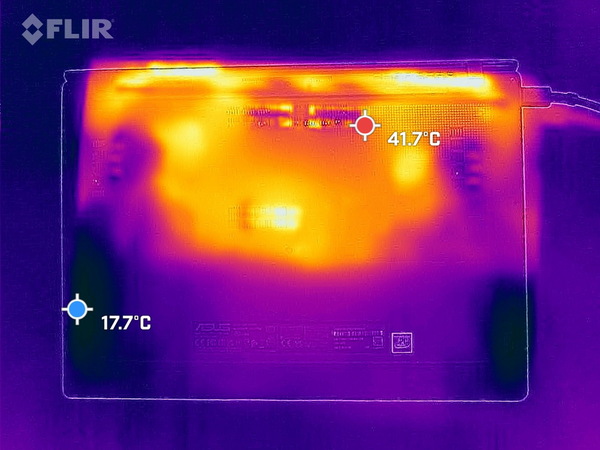 今回「FINAL FANTASY XV WINDOWS EDITION BENCHMARK ver 1.3」を10分間連続実行してみたが、底面温度は最大41.7℃に留まった(室温28.6℃で測定)。