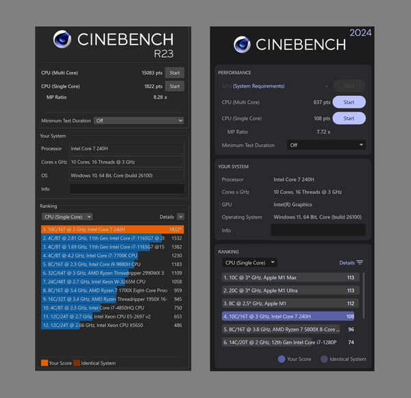 「CINEBENCH R23」のCPU(Multi Core)は15083pts、CPU(Single Core)は1822pts、「CINEBENCH 2024」のCPU(Multi Core)は837pts、CPU(Single Core)は108pts