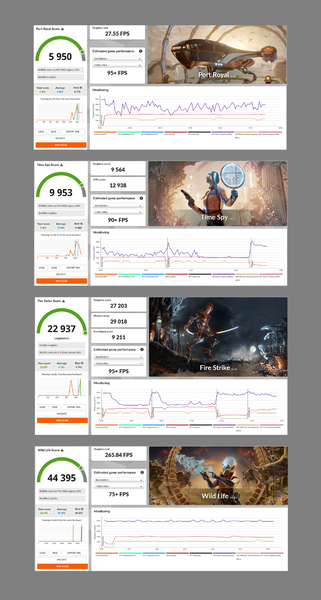 3Dグラフィックス性能については、「3DMark」のPort Royalは5950、Time Spyは9953、Fire Strikeは22937、Wild Lifeは44395が出た。