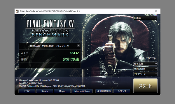 また、「ファイナルファンタシーXIV:暁月のフィナーレベンチマーク」(1920×1080ドット、標準品質、ノートPC)のスコアは26623(非常に快適)、「FINAL FANTASY XV WINDOWS EDITION BENCHMARK ver 1.3」(標準品質、1920×1080ドット、フルスクリーン)のスコアは12432(非常に快適)となった。