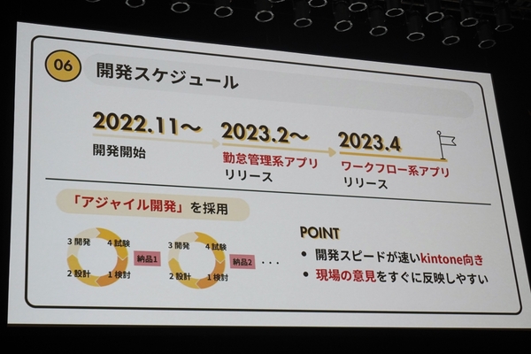 短期間での導入を実現するために採用したのが、“アジャイル開発”である。完成形を最初に定義するウォーターフォール開発とは異なり、優先度の高い機能から順次開発を進め、徐々に完成度を高めていくアプローチだ。「アジャイルがkintoneと相性が良く、現場の意見を取り入れながらアプリが出来上がっていきました」(西田氏)